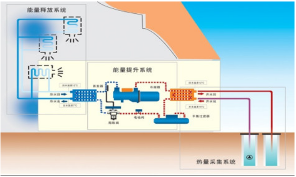 水源熱泵工作原理大致是,夏季將建筑物中的熱量轉(zhuǎn)移到水源中,由于水源溫度低,所以可以高效地帶走熱量,而冬季,則從水源中提取熱量。