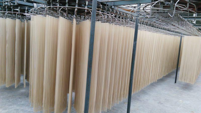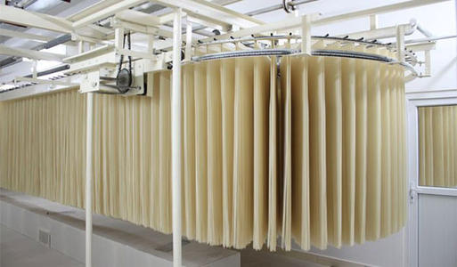 剛進入烘房內的濕面條長度一般在1.4m 左右,水分含量大,易因自重拉伸而造成斷條。 所以,這個階段的任務是除去濕面條表層的一部分水分以固定其組織,增加強度。此階段需保證強通風,加強空氣流動的辦法來促進水分蒸發,控制室溫為20-30 ℃,時間為總烘干時間的15%,水分由32%35%下降27%28%
